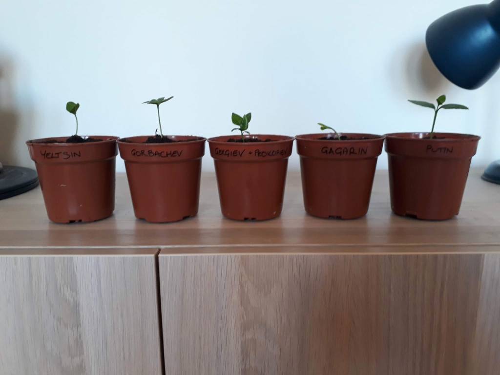 Our new comrades, the lemon tree seedlings. From left to right, Yeltsin, Gorbachev, Gergiev and Prokofiev, Gagarin, Putin